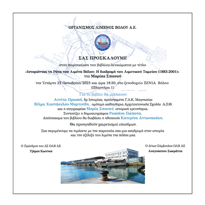 Την Τετάρτη 22 Οκτωβρίου 2025 και ώρα 18:30, στο ξενοδοχείο ΞΕΝΙΑ Βόλου (Πλαστήρα 1), θα παρουσιαστεί το βιβλίο – λεύκωμα με τίτλο «Ιστορώντας τη Ρότα του Λιμένα Βόλου: Η διαδρομή του Λιμενικού Ταμείου (1883–2001)» τηςερευνήτριας Μαρίας Σπανού.