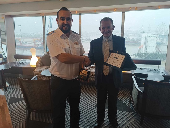 Ο Διευθύνων Σύμβουλος του Οργανισμού Λιμένος Βόλου κ. Σωκράτης Αναγνώστου, συζήτησε με τον καπετάνιο για θέματα κρουαζιέρας και οι δύο άντρες αντάλλαξαν αναμνηστικές πλακέτες.
